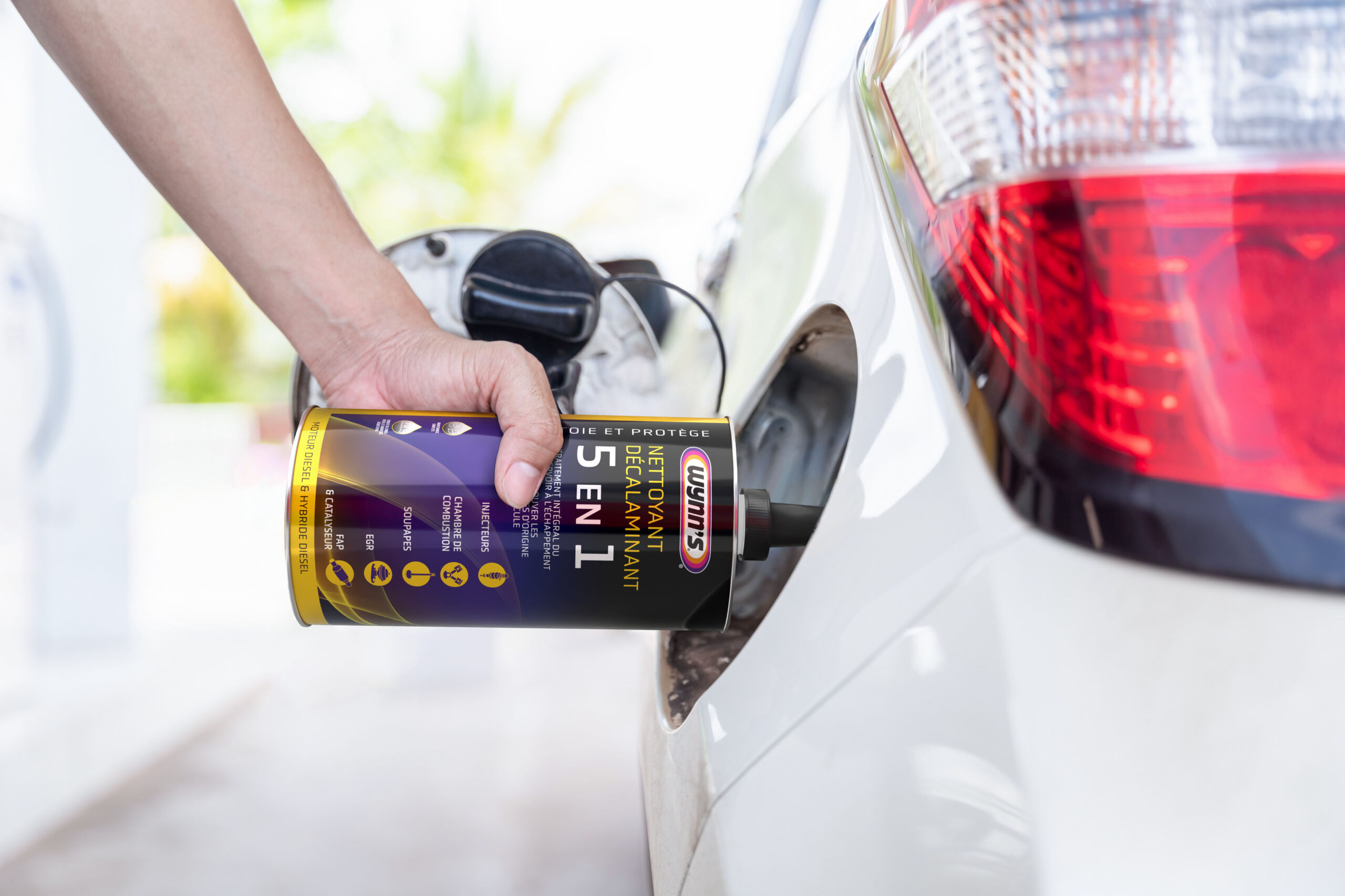 - Ajouter tout le contenu du Nettoyant Décalaminant 5 en 1 Diesel lors d'un plein de carburant en utilisant le bec fourni